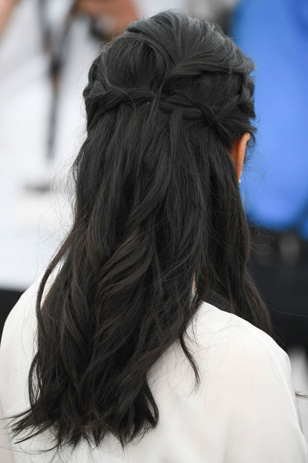 Um die frisur nachzustylen, die haare mit einem lockenstab leicht wellen und am kopf verteilt mehrere kleine zöpfe flechten.